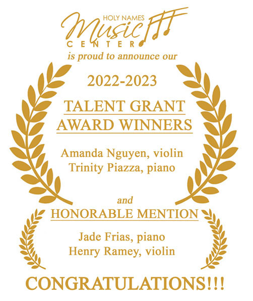 Only a small number of students are nominated by their instructors each year, it is an honor just to be recommended, and a tremendous opportunity to compete. Holy Names Music Center’s Annual Talent Grant Competition is unique in that the student’s talent and potential are both considered – making it possible for even a beginning student who shows great promise to win the grant. This year’s participants all demonstrated terrific musical competence, artistic sensibility and potential, and were a credit to their efforts and their teachers. We look forward to following their progress and accomplishments into the future!